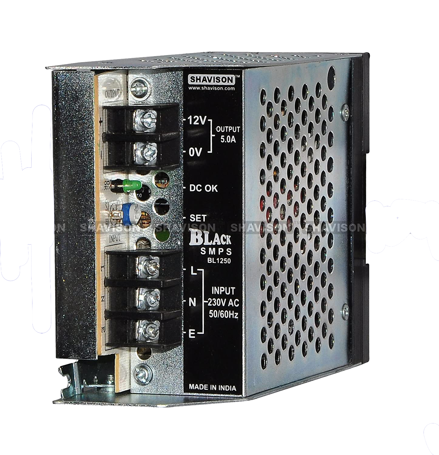 Power OK indication, terminations, output set control & rating details on front
